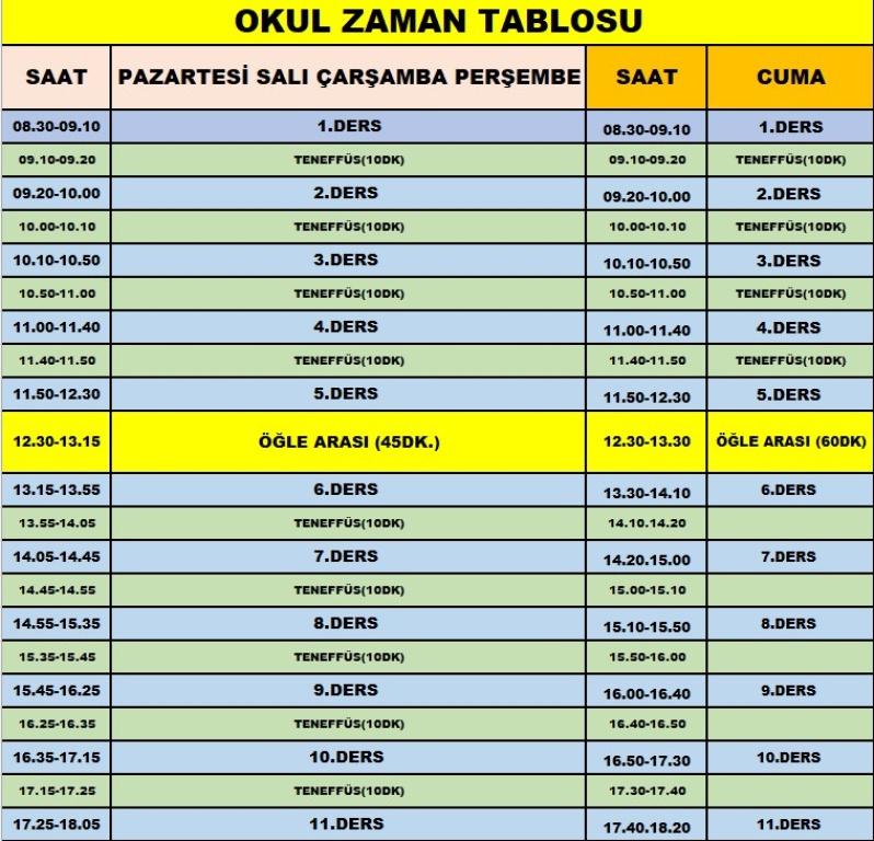 Ders Zaman Çizelgesi-Ders Giriş ve Çıkış saatleri